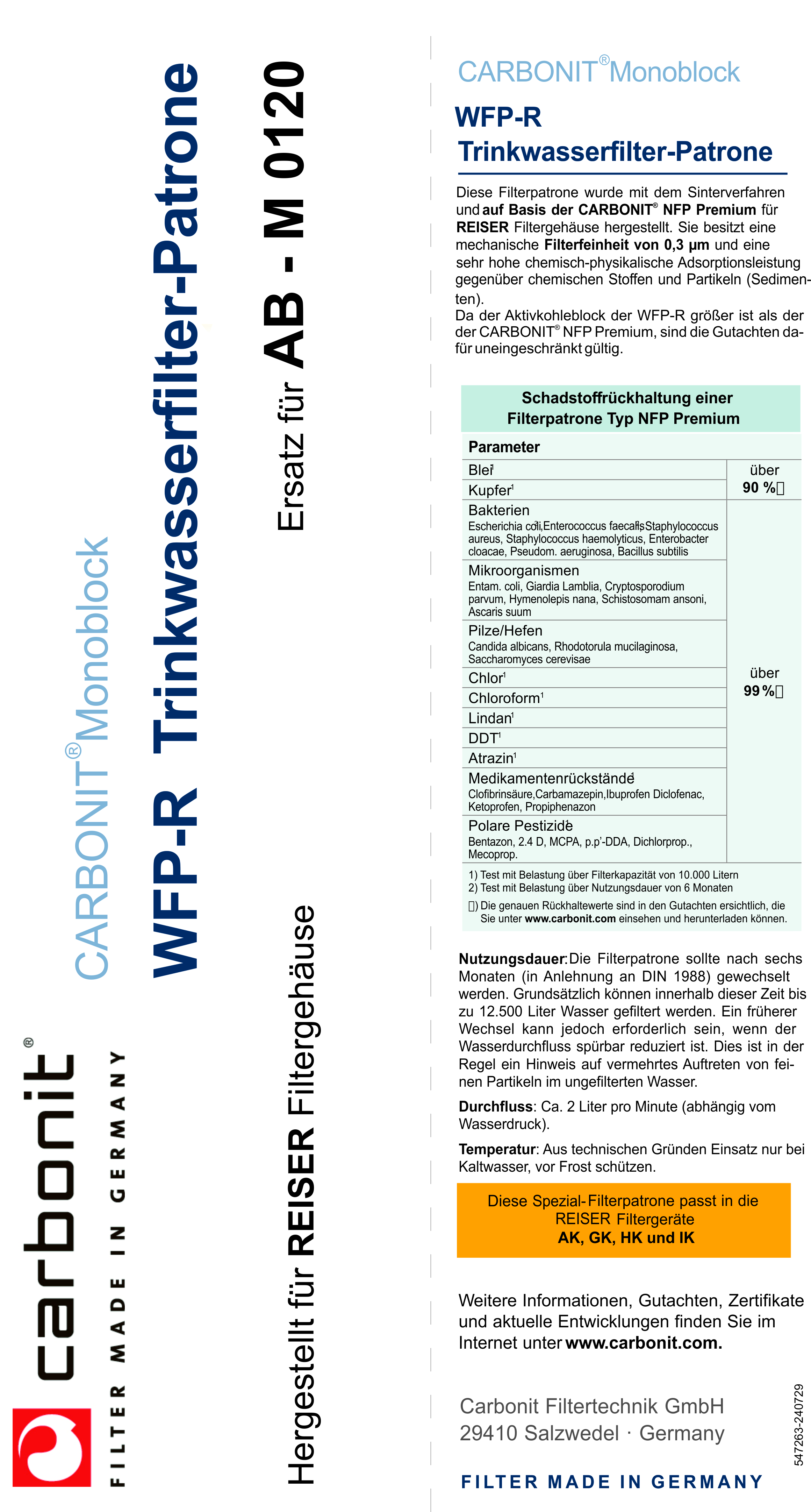 Datenblätter & Infos "0,3µ Kohlefilter, für Reiser Untertisch Filtergehäuse, 10 Zoll"
